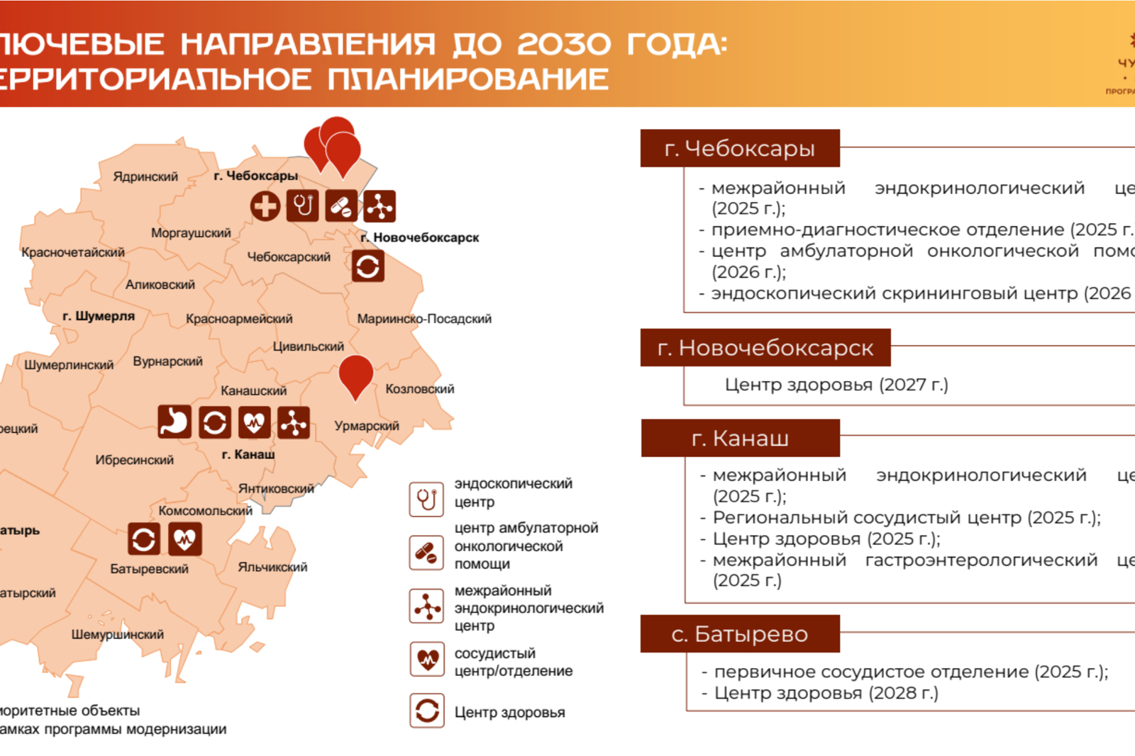 На базе Канашского медцентра до конца года будет открыт Региональный сосудистый центр, а также эндокринологический и гастроэнтерологический центры. На базе Больницы скорой помощи появится современное модульное приемно-диагностическое отделение.